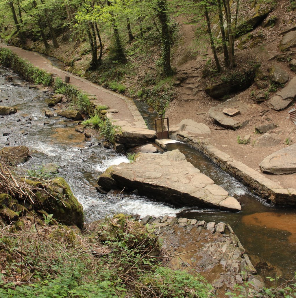Pour mener à bien cette construction, les moines ont dû par endroits contourner ou entailler la roche en granit (brèche Saint-Étienne, baignoires, bretèches) et soutenir l’installation par des murs de soutènement épais et étanches afin de faire passer les eaux ainsi déviées à une quarantaine de mètres au-dessus du précipice.